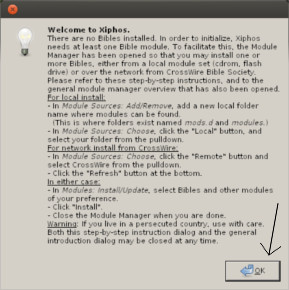 При первом запуске программы «Xiphos» появится окно приветствия. Нажмите кнопку «OK» для продолжения.