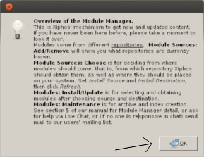 Первый раз при запуске «Xiphos» также появится информация о Менеджере Модулей. Нажмите кнопку «OK» для продолжения.